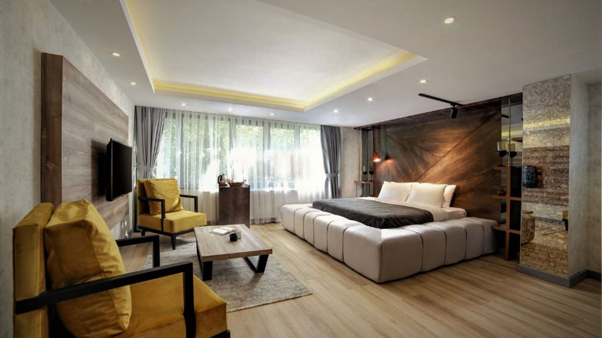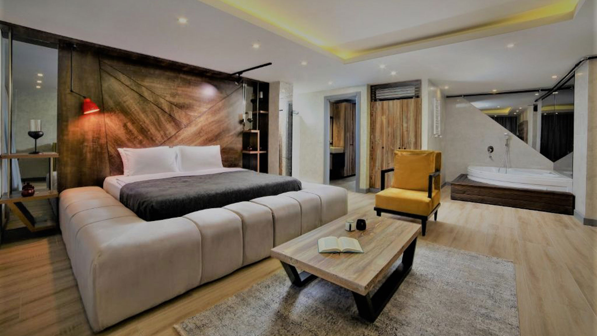 40 m2 Room, Max 2 Guests, 1 Bedroom , Large Bed (King size) - 180 ⟫ 192 cm wide ,1 Seating Area, Jacuzzi, LCD Tv, 1 Bathroom, Washing Machine, Hair Dryer, Shower, Towels, Kettle, Toiletries, Ironing Facilities, Air Conditioning, Soundproof Rooms, Heating, Refrigerator, SafeBox.