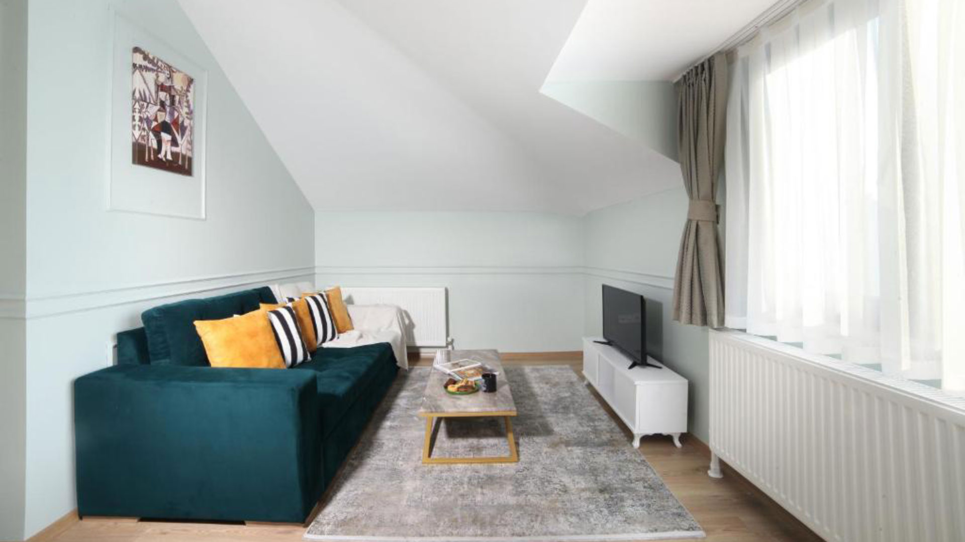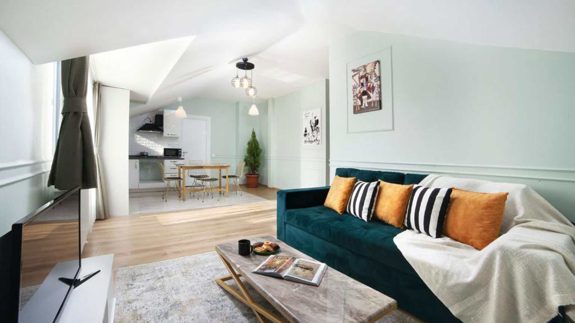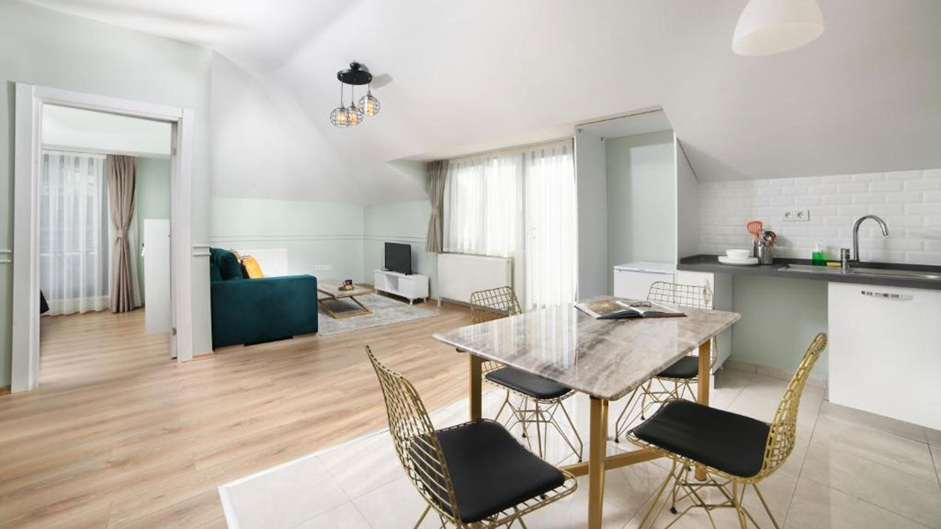 75 m2 Room, Max 3 Guests, 1 Bedroom, Large Bed (King size) (151-180 cm )wide, 1 Living Room, LCD Tv, 1 Bathroom, Hair Dryer, Washing Machine, Shower, Towels, Toiletries, Ironing Facilities, Air Conditioning, Soundproof Rooms, Heating, Kitchenette, Kitchenware, Microwave, Kettle, Refrigerator, Stovetop, SafeBox.