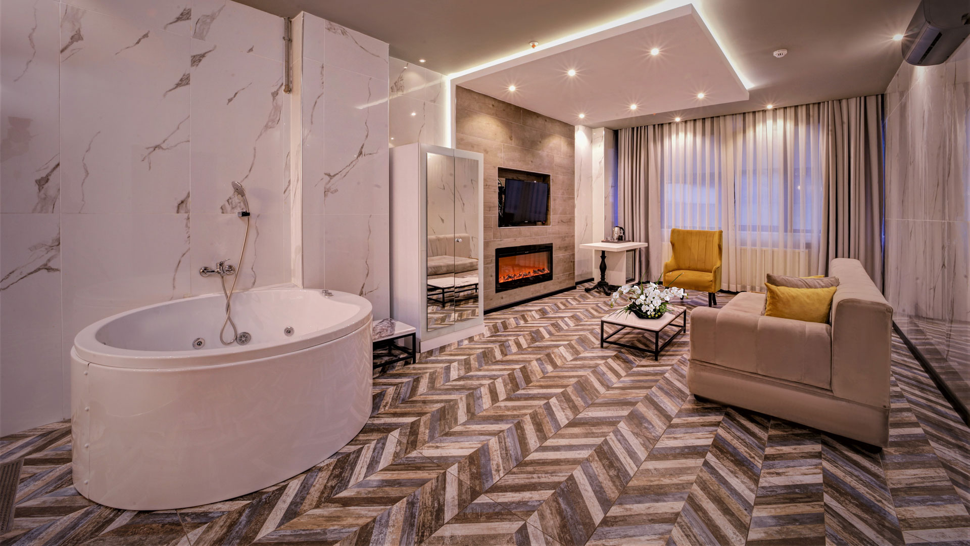 65 m2 rooms, Max 2 Guests, 1 Bedroom, 1 Large Bed (King size), 185 ⟫ 215 cm wide, 1 Seating Area, Jacuzzi, Fireplace, LCD Tv, 1 Bathroom, Hair Dryer, Shower, Towels, Kettle, Toiletries, Ironing Facilities, Air Conditioning, Soundproof Rooms, Heating, Refrigerator, SafeBox.